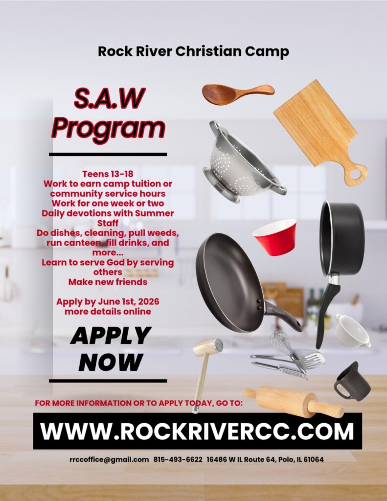 Servants At Work is a program for those 13 to 18 years old. Participants serve at camp for a week and/or weekend, helping out in the kitchen, dining hall, canteen, and on various service projects. The bulk of what they do is dishes. They join the summer staff for daily devotions, learn the importance of serving others, and make new friends along the way. For each week served, participants receive $180.00 towards a week of camp or prorated for the number of days worked or hours that may be used for school community service hours. If you do not need these options, your hours are simply volunteer. No cash is given out for working as a S.A.W. To be considered for the S.A.W. program, you must return a completed S.A.W. application to the camp office by June 1st, 2026. Acceptance to the program is based on availability, need, and prior service experience. Spots are limited, so apply early. If you are interested in serving as a S.A.W. this summer, you may complete the S.A.W. Application by clicking the button on this page, or you can contact us so we can send it to you.